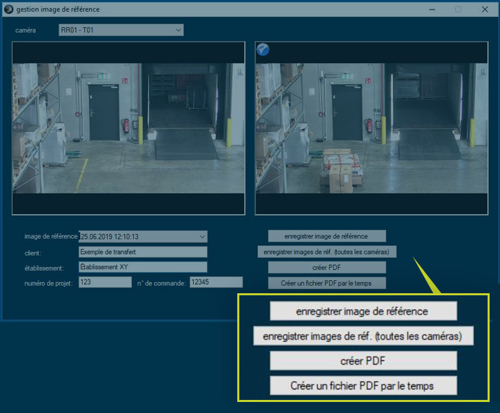 Pour le transfert des images de référence et des images en direct associées de toutes les caméras sous forme de documents PDF.